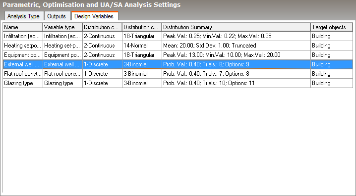 ** Wall, roof and glazing U-values are not direct inputs in EnergyPlus, therefore the variation in U-value must be represented by creating a sequence of construction components to create fixed incremental increases in U-value. Then discrete distributions can be used to represent the variation.